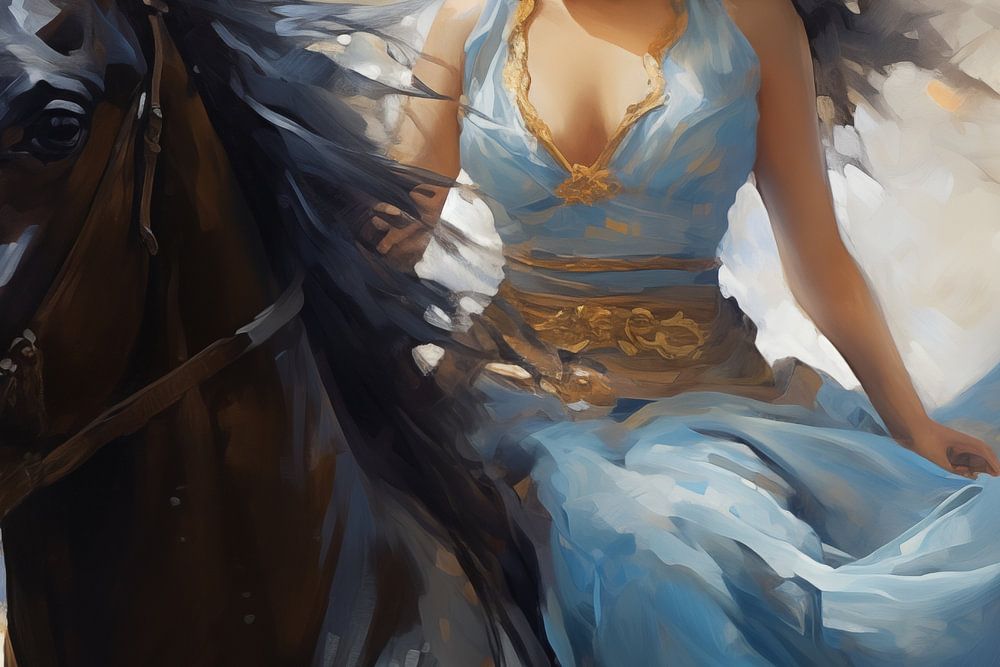 About "Oil painting of a beautiful girl in a blue dress riding a horse"