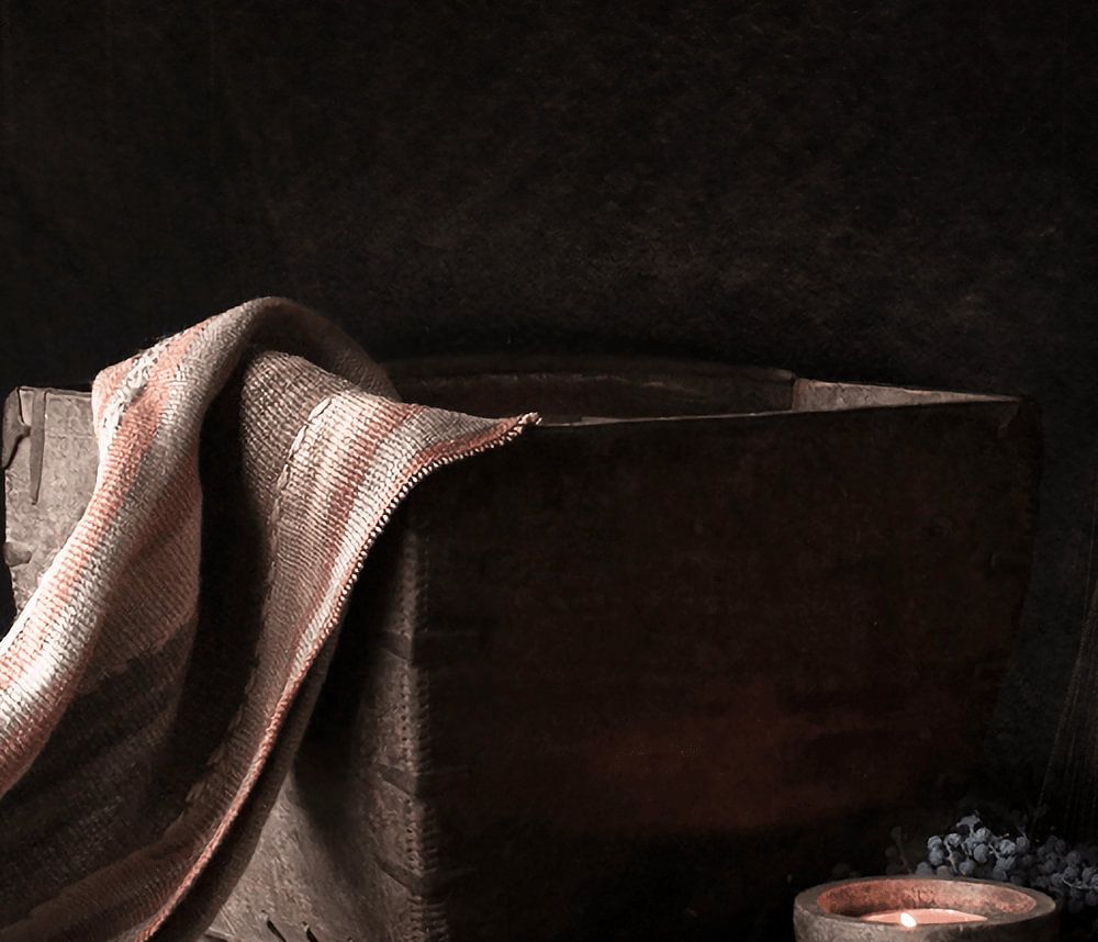 Still Life of Old Antique rice bowl India with colored kelim cloth and candle with beside it a sprig of dark blue dates in beautiful dark colors whose attributes are lit.