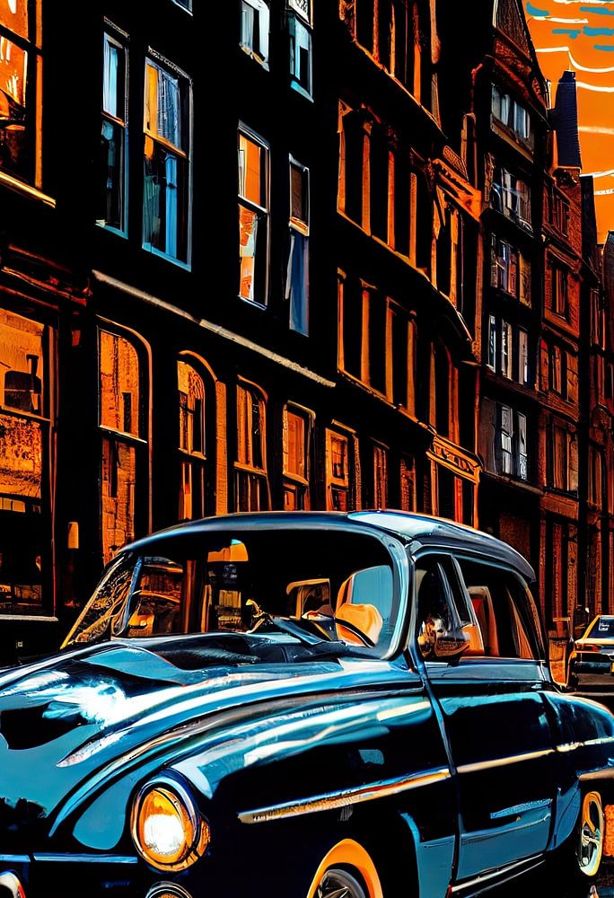 My digital painting 'Old Town Amsterdam' is a unique rendering of the classic canal city on a rainy summer evening. The focal point of the work is an old blue car, driving along the gleaming canals. The car symbolises the timelessness of the city, which has evolved over the years. The classic canal houses with illuminated windows provide an atmospheric background. The image is of high contrast, with dark and light colour accents. Predominantly black, blue and orange colours are used to create the mood of the rainy evening. The car glistens from the wetness, a detail that gives the image an extra dimension. The work is a tribute to the historic city of Amsterdam and old car enthusiasts. It is a powerful and emotional image that takes the viewer to the rainy street in the old city centre. A powerful work that the lover of Amsterdam and old cars will enjoy.
