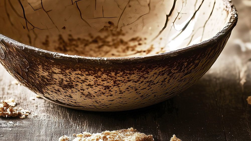 An old, cracked bowl stands on a worn wooden table, surrounded by scattered breadcrumbs. The picture tells of lack and poverty, captured in a quiet, symbolic scene.