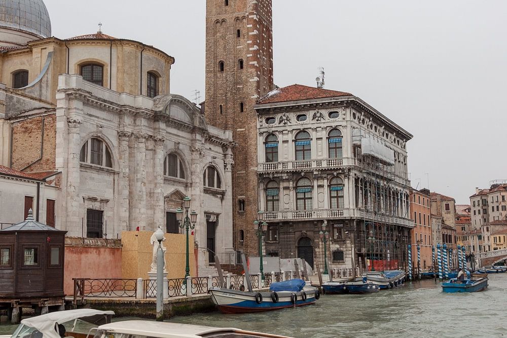 About "Old buildings, church and white speedboat on canal in old town of Venice, Italy"