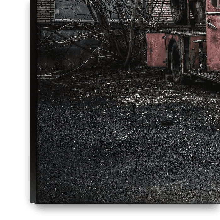 Oude brandweerwagen die staat geparkeerd voor een vervallen kliniek ergens in België.