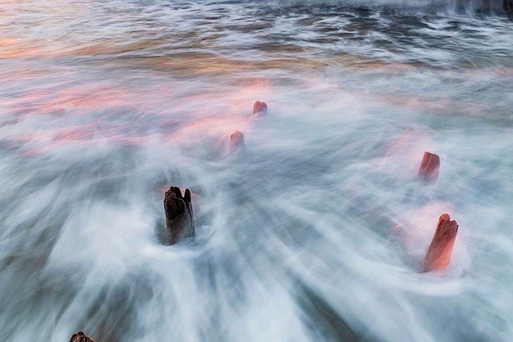 The old groynes are washed by the waves of the Baltic Sea and the setting sun casts its last rays over the sea.