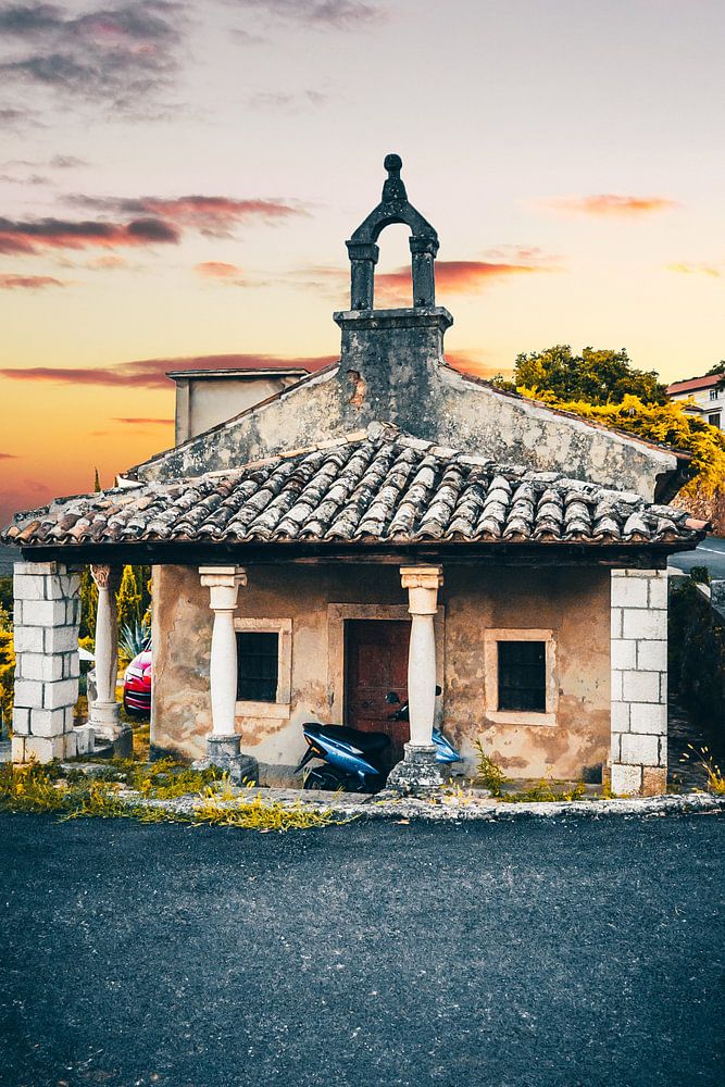 Small historical mountain church in Croatia Moscenice in Istria. it stands between 2 streets on a hill the sun just made its way into the sunset