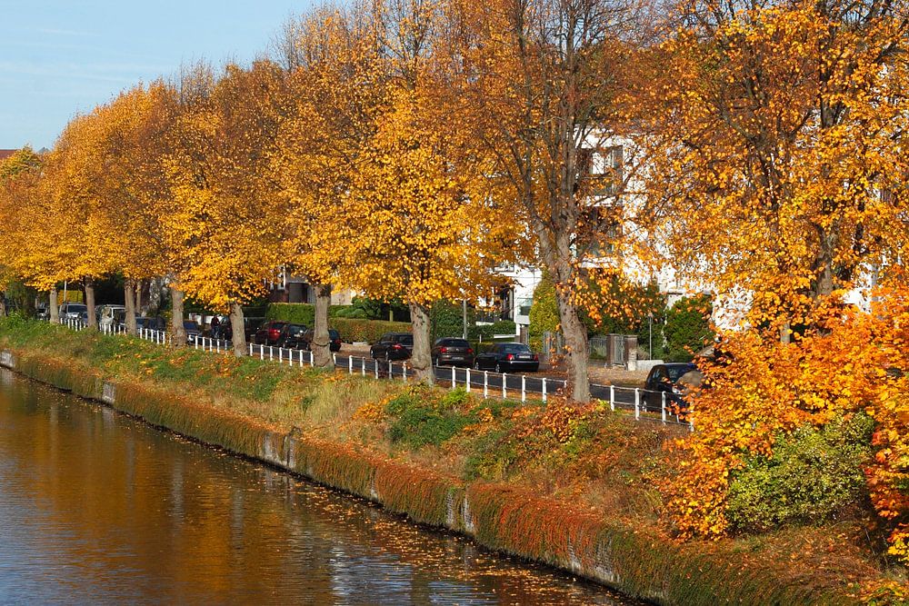 Old residential buildings in autumn at river alster, Winterhude, Hamburg, Germany, Europe I old resi by Torsten Krüger
