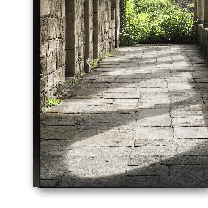 This design showcases a serene, historic corridor with stone vaults, rustic walls and classical pillars. The space exudes a sense of tranquillity and timelessness. The light entering through the opening at the end of the corridor creates beautiful shadows and a natural contrast that accentuates the architectural details. Perfect for lovers of historic architecture and classic style, this image would look great in an interior with classic or rustic décor. Add a touch of history to your space and be inspired by the elegant lines and authentic atmosphere of this design.