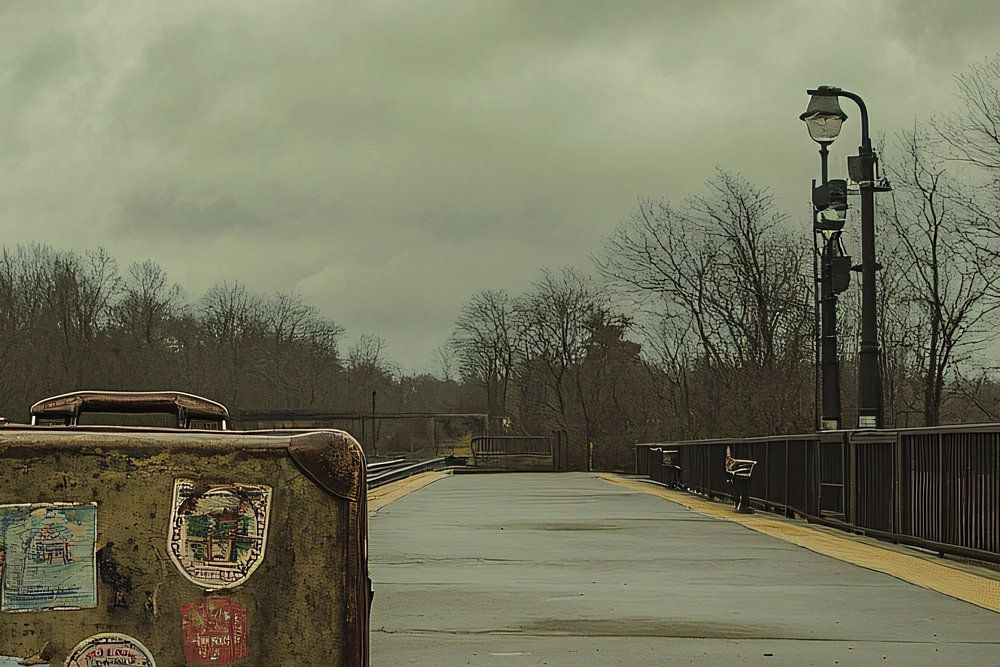 This picture exudes nostalgia and adventure with a weathered suitcase on a deserted platform. The suitcase is covered with old travel labels, evoking stories of distant destinations and days gone by. The grey sky and empty surroundings reinforce the feeling of desolation and waiting for the next adventure. This design would fit perfectly in an interior that evokes calm and reflection, such as in a living room or hallway, where it can convey the atmosphere of travel and discovery. For lovers of vintage travel souvenirs and classic photography.