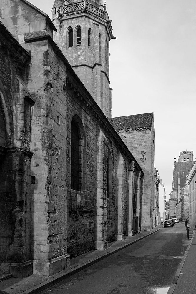 This work shows a street in the old town of Dijon. In the left foreground, light and shadow are playing on who can conjure up the most beautiful shapes on the wall. In the background, a pointed tower looms.