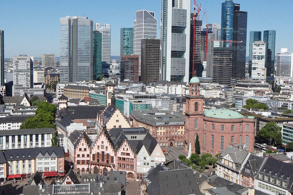 Römerberg, city hall Römer, Paulskirche, old town, banking district, view from the cathedral tower, Frankfurt am Main, Hesse, Germany