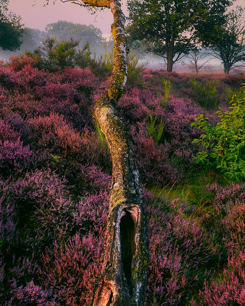 An old tree half standing in a colorful heath near Hilversum a beautiful morning with sunrise.