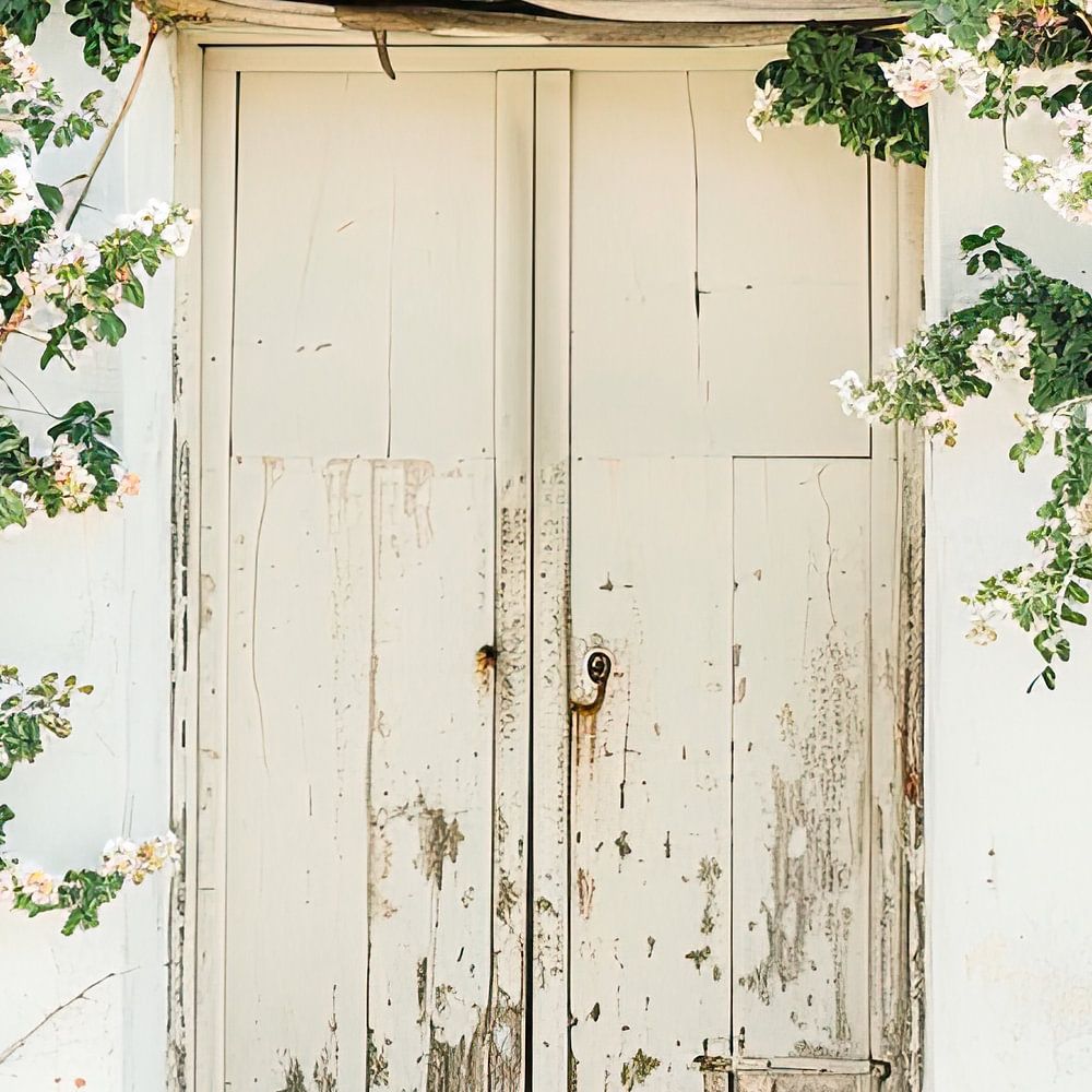 The image shows a weathered white door framed by flowering pink climbing roses against a wall with peeling paint. In the wall is a door to a courtyard. The scene exudes an air of past beauty and rustic charm. A summer village scene somewhere in southern Europe.