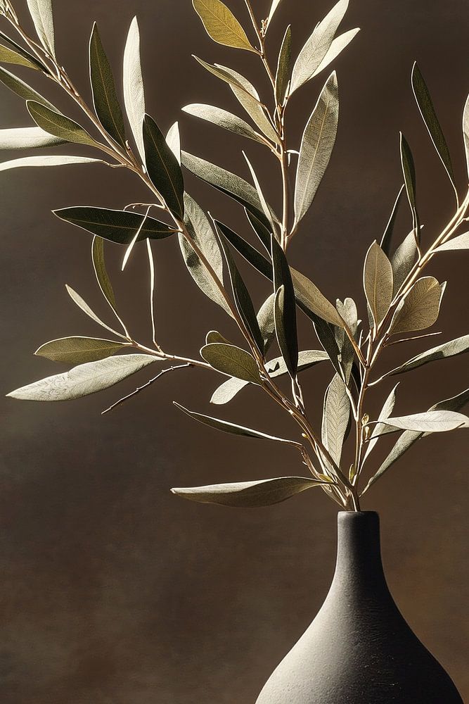A beautifully simple design featuring a sleek, modern black vase and a single olive branch. This minimalist sculpture exudes calm and elegance, ideal for creating a tranquil atmosphere in any room. The soft tones of the olive leaves against the dark vase create a serene look that is perfect for modern or Scandinavian decor. The natural element of the branch brings freshness and life to the interior without being overwhelming. A timeless and stylish accent piece for the living room, dining room or office.