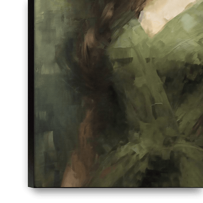 Impressionist portrait of a young woman with long brown hair wearing an olive green dress with a large hat.