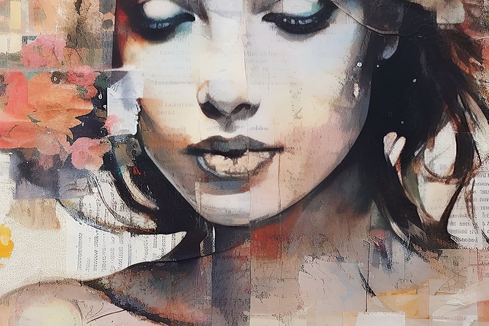 Olivia Portrait - abstract painting / mixed media art painted. Nice contrast between sophisticated portrait and raw collage/painting technique.