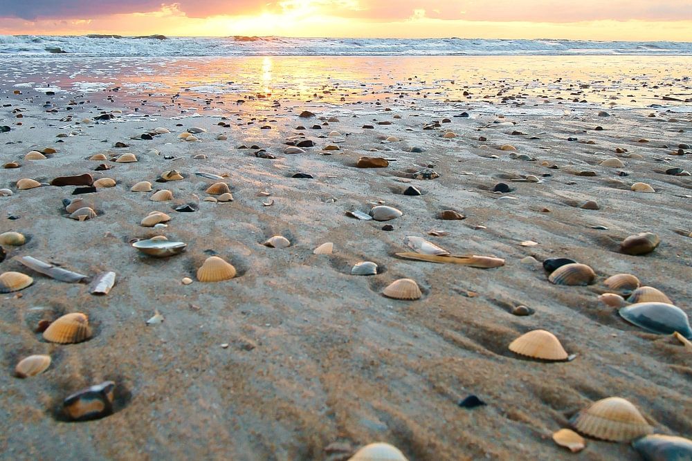 On the beach at Blåvand at sunset by the sea. The water of the North Sea glows in orange and red colours. Kilometres of wide sandy beaches. Peace and relaxation