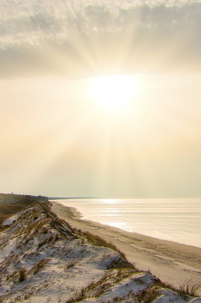 On the beach of the Baltic Sea, with dunes. Large sand dunes stretching along the coast. Sandy beach and sea. Landscape shot by the sea