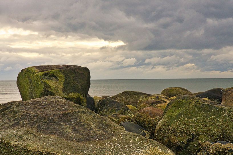 On the beach of Blåvand stone groynes into the sea. View over stone groynes into the sea.