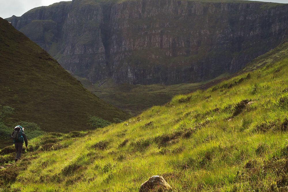Hiking on the Skye trail, with mountains on the side. Isle of Skye, Scotland.