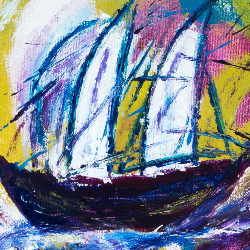 Painting of a sailing ship on the way home in rough weather. Also available in a version with size of 3:4.