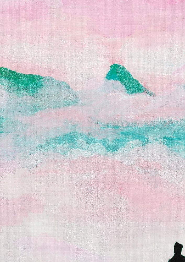 Acrylic on paper - A silhouette of a man stands on a mountaintop looking out over a landscape of soft pink sky and mist, with the contours of mountain ranges below. The image exudes calm, reflection and a touch of wonder. The combination of the silhouette and dreamy colours creates a powerful contrast and a sense of space. A painting that invites you to pause and catch your breath.