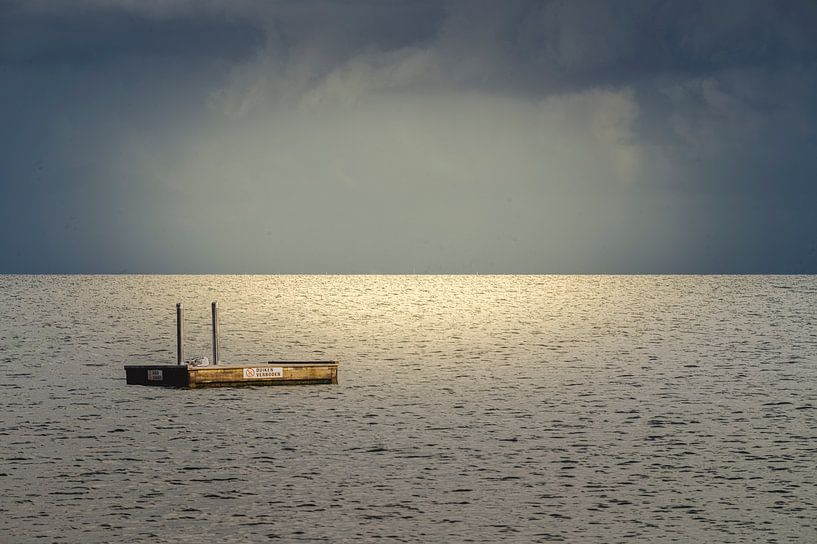 This image shows a seagull sitting on a pontoon floating along on the current of the Wadden Sea.