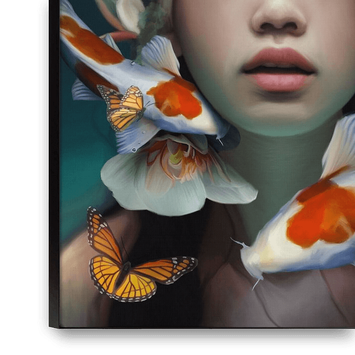 "Oncidium" is a captivating portrait of a woman immersed in the mysterious underwater world. Her figure, amidst crystal-clear waters, is surrounded by a dazzling ballet of orchids, butterflies, and two Japanese fish gracefully gliding around her.