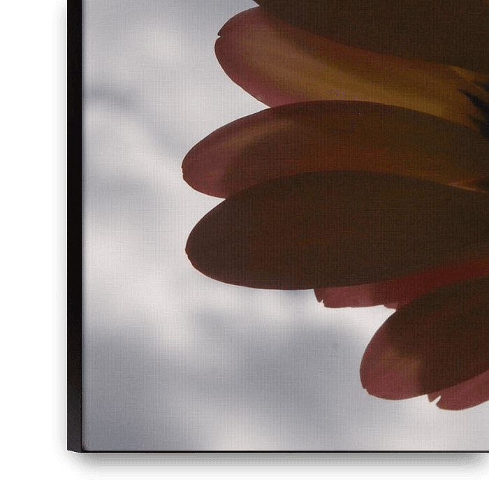 Door middel van macrofotografie de onderkant van deze Gerbera gefotografeerd tegen het zonlicht in. De zon schijnt tussen de wolken door.
