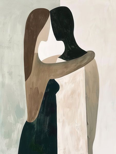 The composition uses simple shapes and a limited colour palette of earth tones, greens and greys to emphasise the essence of their connection. The woman, with long brown hair and a dark dress, embraces the man…