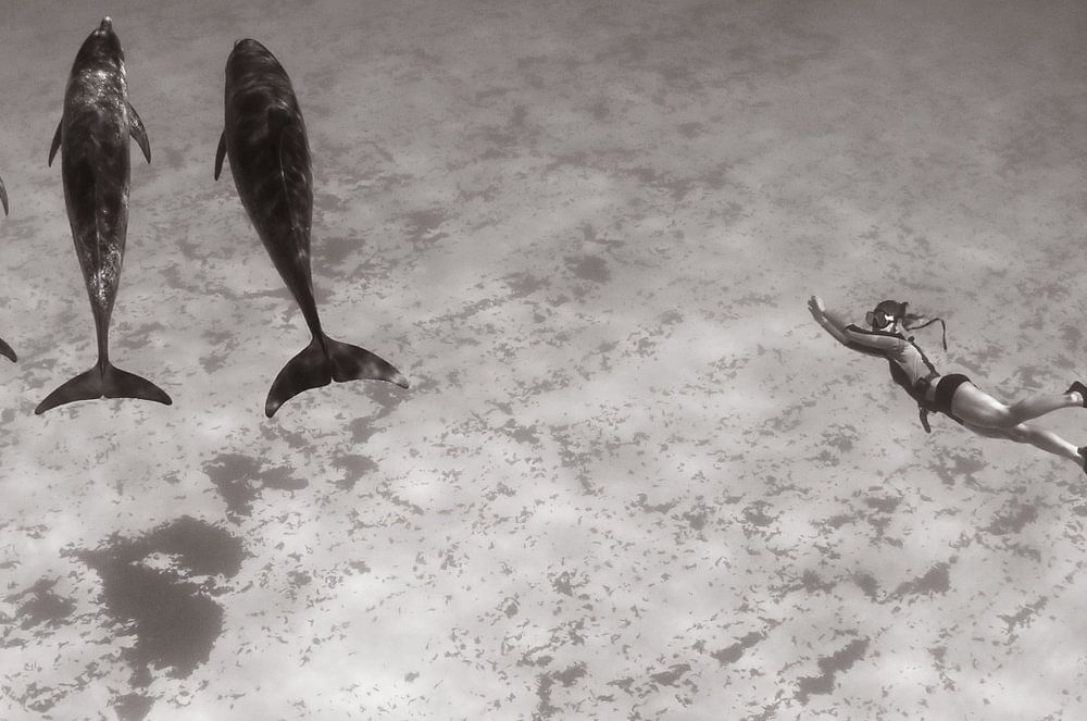 A freediver joins in with a group of three dolphins. Freediving is the best way to interact with these animals since it is a very natural way of behaving in the water column.