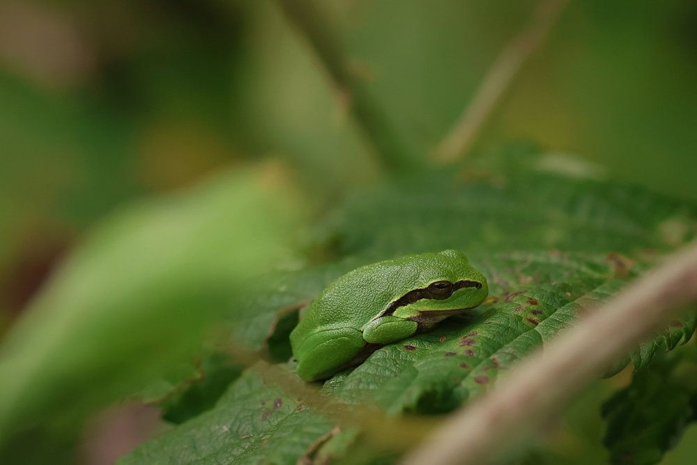 In a small forest in North Brabant, in a small patch of blackberry bushes along a flooded field, little gems can be found. These tree frogs are small (max 3 cm), sit silently and blend into their surroundings with their green colour. The frogs are active at dusk and night, sitting quietly during the day. Spotting them is quite an art, but once you spot one, it gets easier and easier to find more.