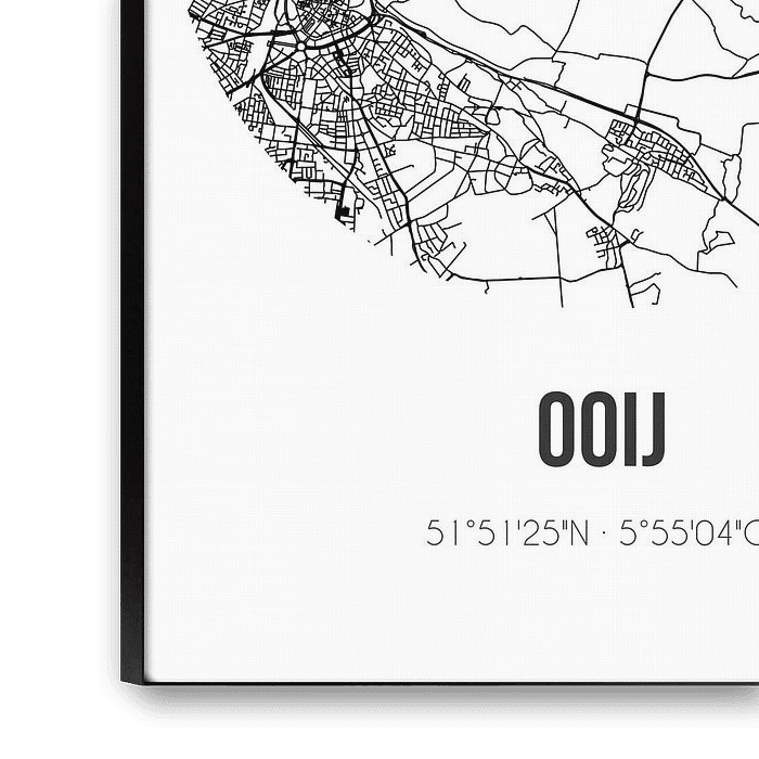 Black and white map, street map or street plan of Ooij. Ooij is located in the region Rivierenland, in the municipality Berg en Dal, province Gelderland. On the city map all public roads in Ooij are included. Furthermore, the map is provided with the coordinates of the center of Ooij.