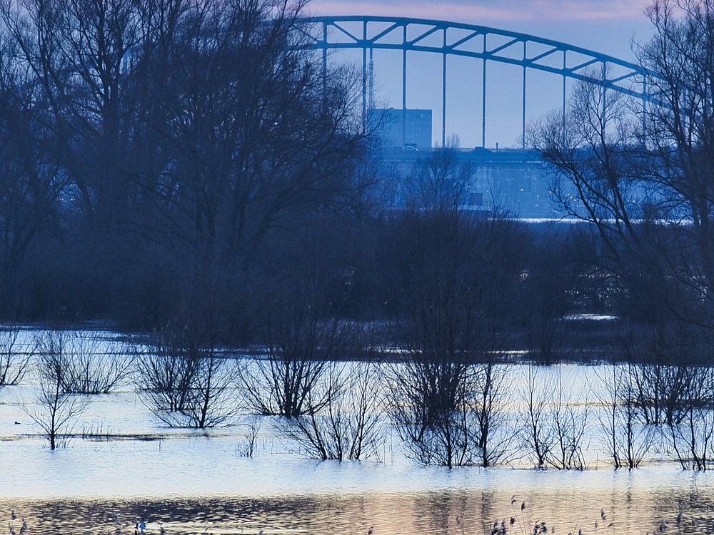 High tide in the Ooijpolder near Nijmegen with the bridge near Nijmegen in the background. The setting sun colours the sky.