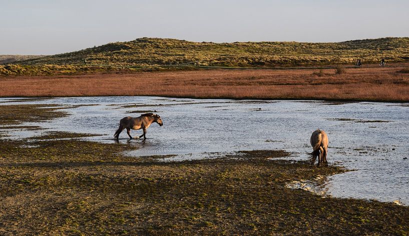 Konik horses at a pond in the De Boschplaat nature reserve on the Dutch West Frisian island of Terschelling.