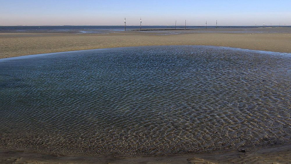 Drooggevallen zandplaten met zoutwatermeertje in de oostelijke Oosterschelde