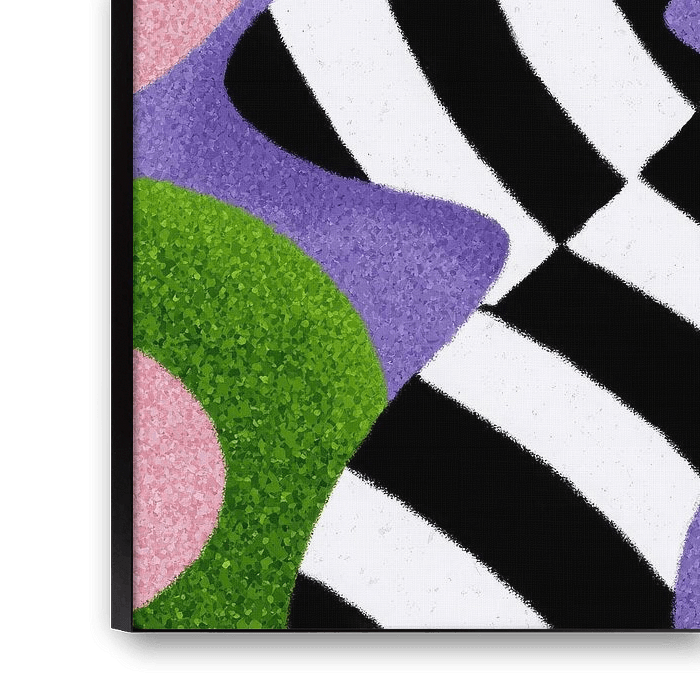 This artwork shows a close-up of black and white striped elements on a purple carpet with pink and green circles. Inspired by op art and modern graphic design, the flat illustration creates a dynamic effect through strong contrasts between light and dark. The clear, graphic composition combines detailed elements with a minimalist style, creating movement and structure. Realised in high resolution, the image is both lively and elegant. The combination of playful colours, geometric patterns and optical illusion makes this work an eye-catching, modern piece of art for anyone who appreciates graphic precision and visual dynamism.