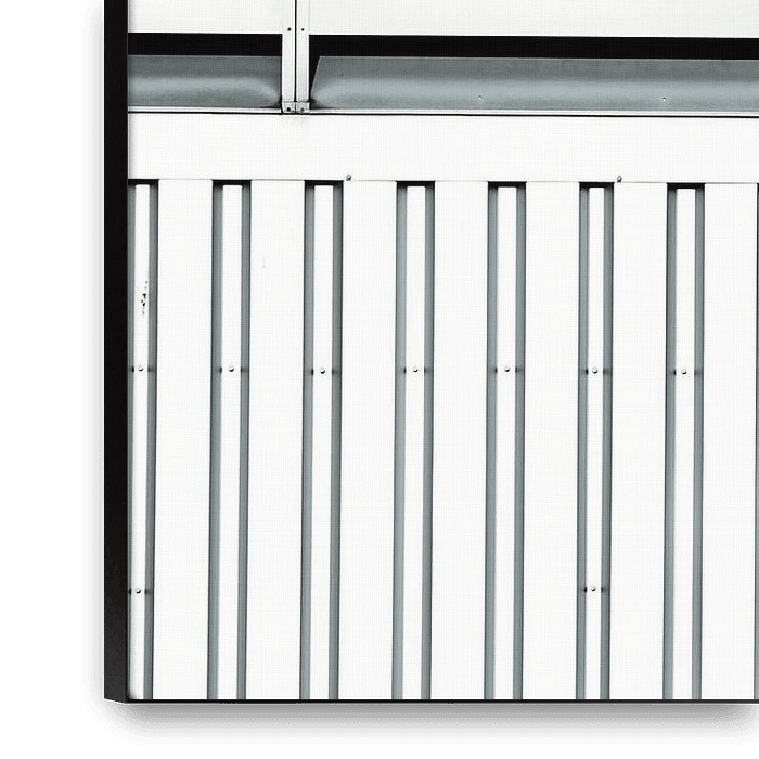Open air grating stealing the picture of this steel sheet building shining it's horizontal and vertical lines in Black and White.