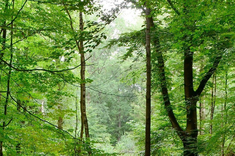 A photograph of a forest landscape. In the centre of the image, there is an opening between the Beech trees to reveal a clearing. This causes light to fall on the ground in the centre of the image.