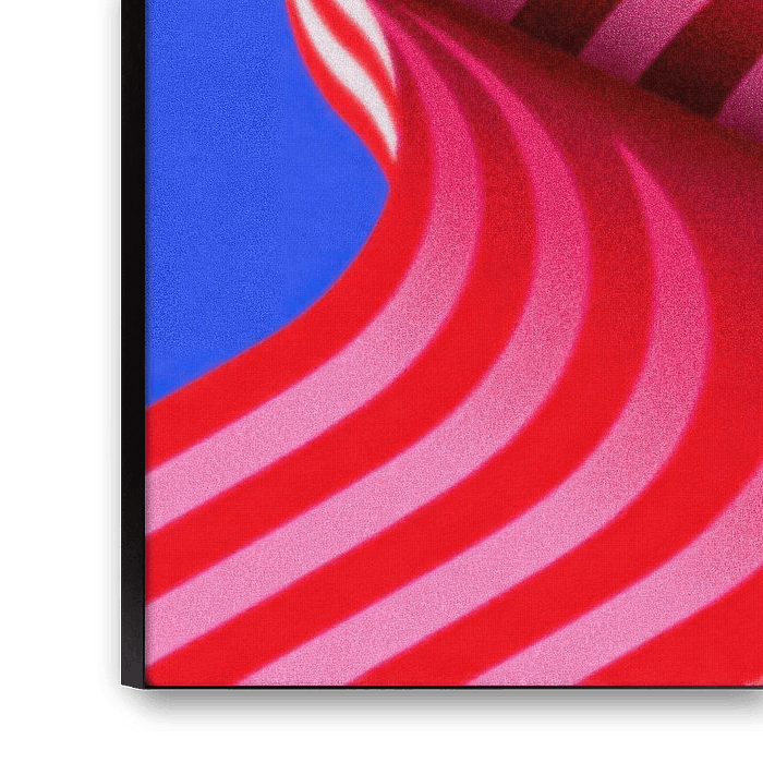 This design shows a red and pink striped band on a blue background. Overlapping shapes create a three-dimensional effect that creates an optical illusion of movement and depth. Implemented in high-resolution vector graphics, the pattern impresses with razor-sharp details and flowing colour gradients. The combination of elegance, dynamism and simplicity makes this work particularly versatile. It combines the classic look of a ribbon with modern graphic sophistication and is ideal for lovers of geometric, minimalist and abstract art styles.