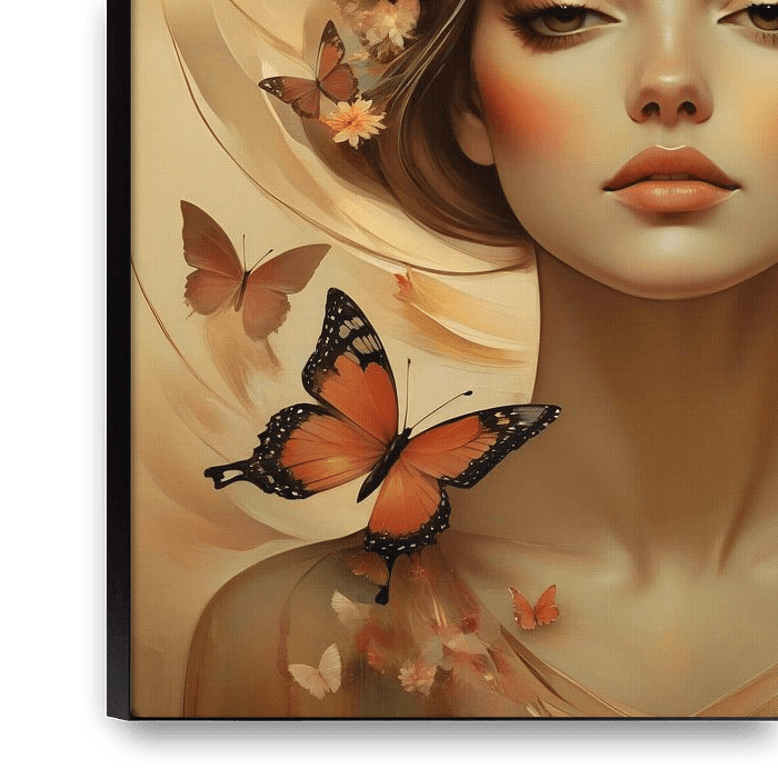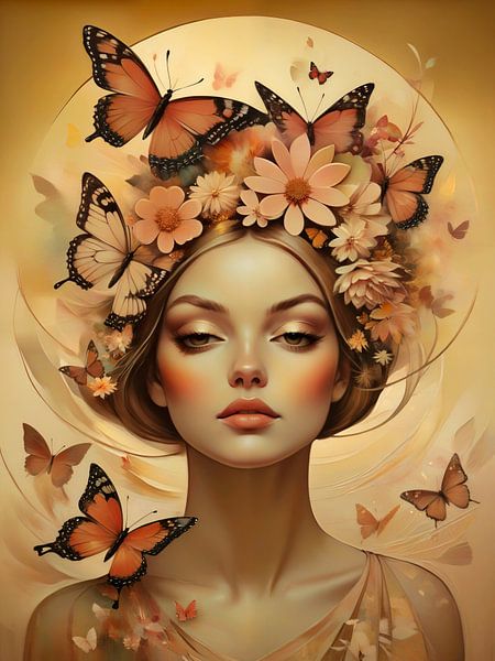 “Orange Butterfly Garden” is an enchanting piece of AI art in which a dreamy portrait of a girl blends with a world of flowers and graceful butterflies. The piece exudes warmth, softness and mystique through the use of orange tones and subtle golden-brown accents.