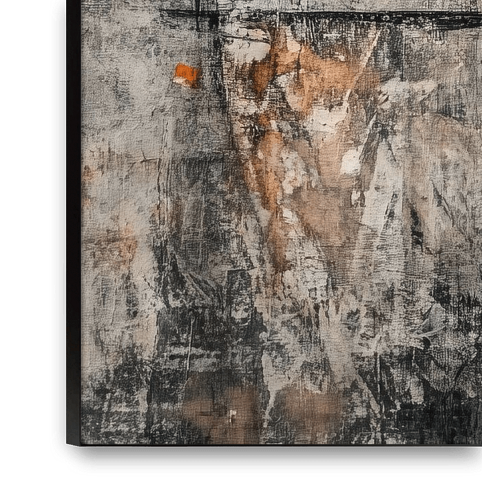 Orange Circle | Circle of Rust and Light - This abstract painting features a large, scraped orange circle to the right of centre, set against a broad white arc on a rough grey-beige background with dark lines and rich texture; as an abstract painting, the warm orange colour and contrasting black-and-white accents are particularly…