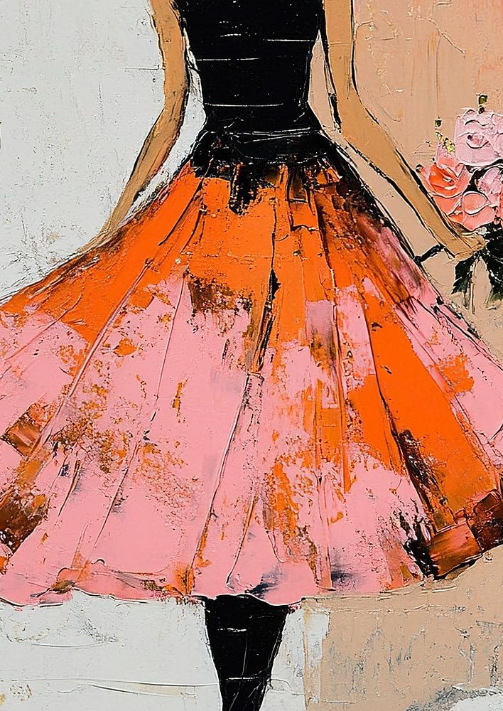 Orange Dress Gold Background - This women's painting shows an elegant woman seen from behind, wearing a striking, flared orange-pink dress and a bunch of pink roses, against a background with abstract gold and cream tones that exude calm and serenity.