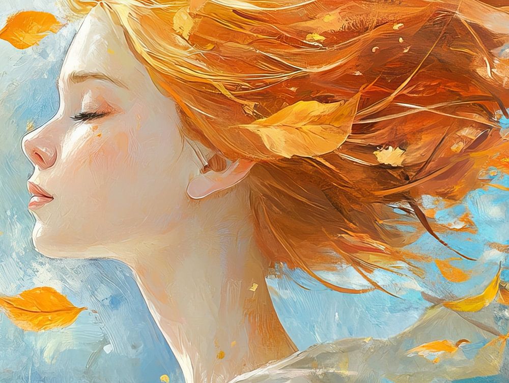 Orange Hair - This woman painting shows a young lady with beautiful, blowing, orange hair, surrounded by golden leaves floating in the air, against a calm bluish background.