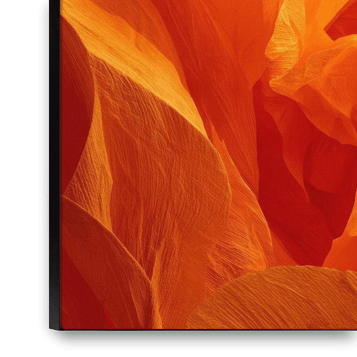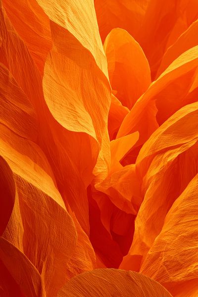 This impressive macro shot of orange petals captures the intense glow and delicate texture of the flower in an almost abstract composition. The warm interplay of bright orange and golden yellow creates a lively, energetic look, while the soft folds and veins add depth and elegance. The interplay of light and shadow creates a dynamic…