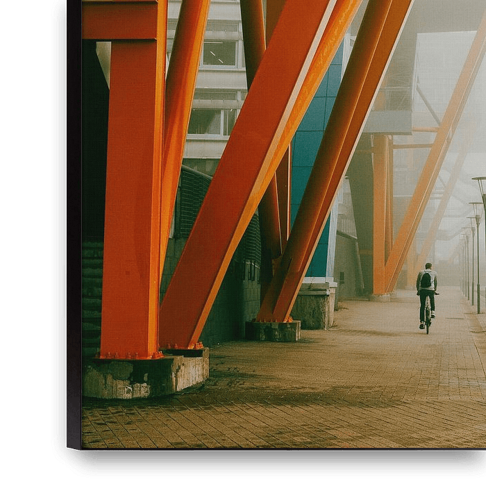 Bold orange steel braces carry a modern building along the quay as streetlights and a lone cyclist fade into the morning fog. Clean geometry, industrial detail and soft haze turn this scene into calm, design-forward…