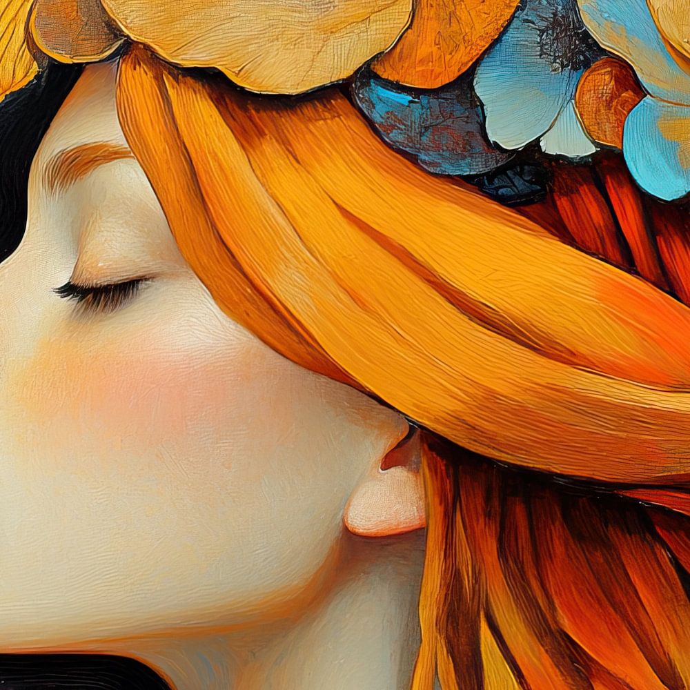 Details: women painting, flower painting, profile portrait, orange flower, yellow flower, art woman, art flowers, women's face, painting woman