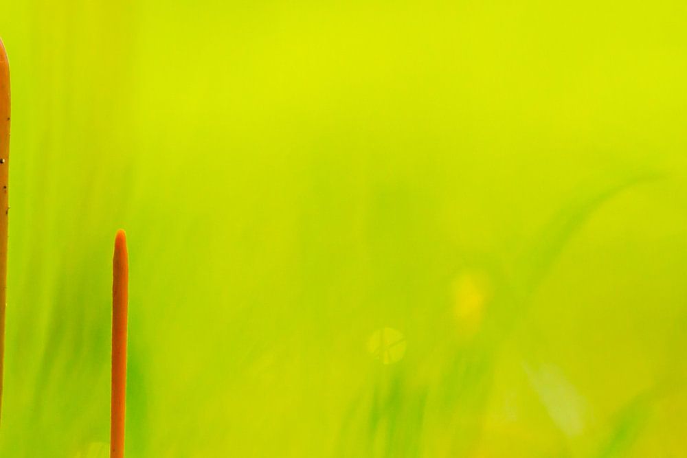 Two orange club mushrooms (Clavulinopsis) in the green grass. The mushrooms themselves are not much larger than the blades of grass.