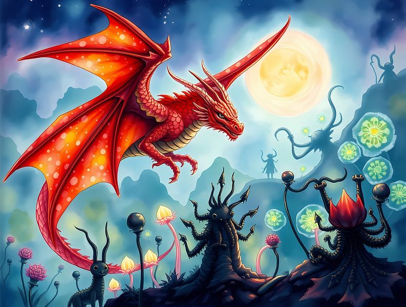 An orange dragon flies through the night, surrounded by strange creatures,