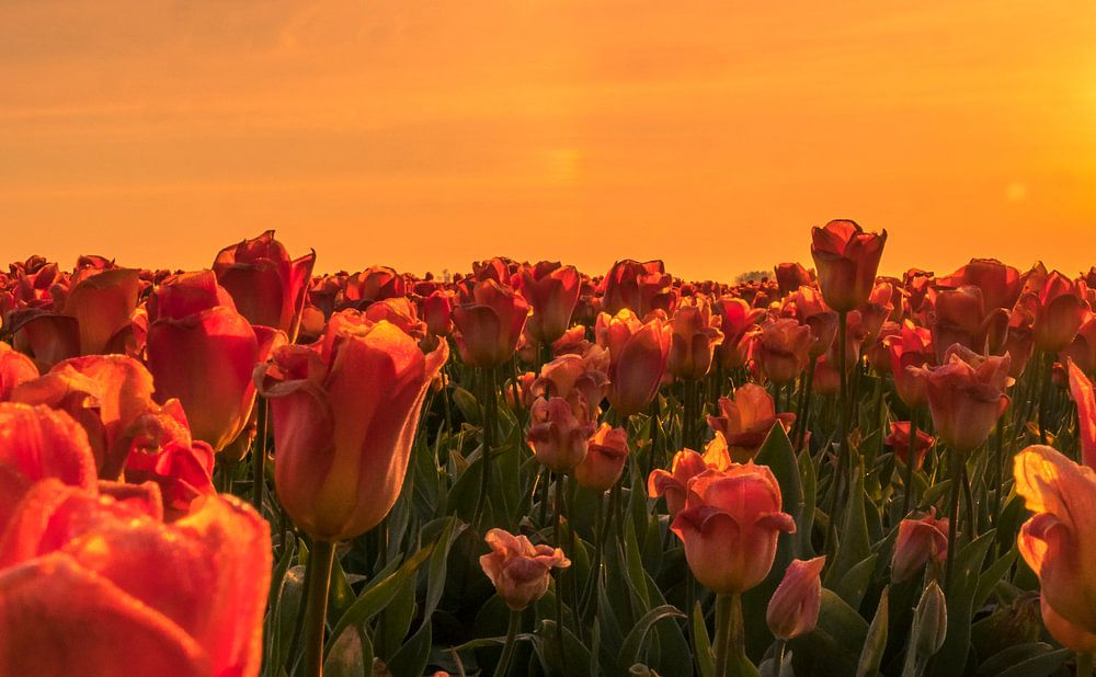 Tulip fields at Egmond aan den Hoef near Zonsopkomst. With 'De Wimmenumermolen' (The Wimmenumermill), in the background, is an octagonal inner crucifixor built in 1774.