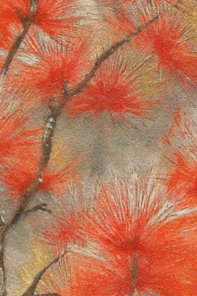 This work depicts a branch full of plumed needles in intense shades of orange, interspersed with soft cream and subtle yellow nuances. Against the grey background, the colours seem to glow extra, while the loose brushstrokes give a sense of movement and lightness. The texture of the paint is clearly visible, giving the image a vibrant, almost tactile quality.