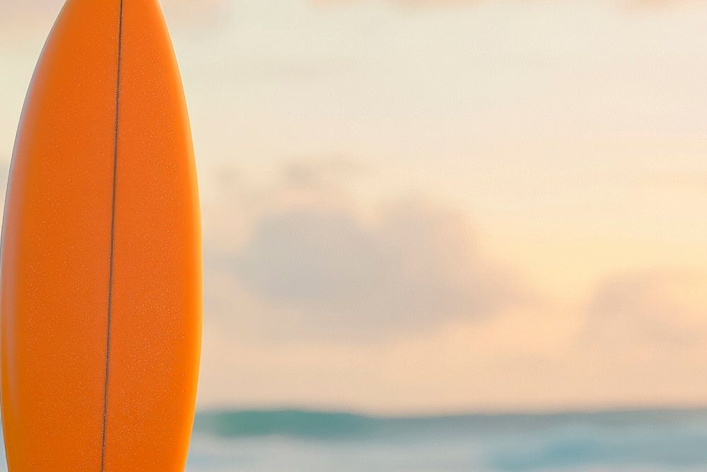 A bright orange surfboard rises majestically against a soft, pastel-coloured sky. It conveys a sense of freedom and adventure, perfect for any room thirsting for inspiration. Especially in a living room or beach house, this artwork will create a relaxing, summery atmosphere.